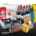 The Premium Emergency Kit is our most comprehensive set and, in addition to all items from the Pro kit, includes extra provisions for prolonged emergency situations, such as an emergency ration and a water filter that can be connected to the tap.